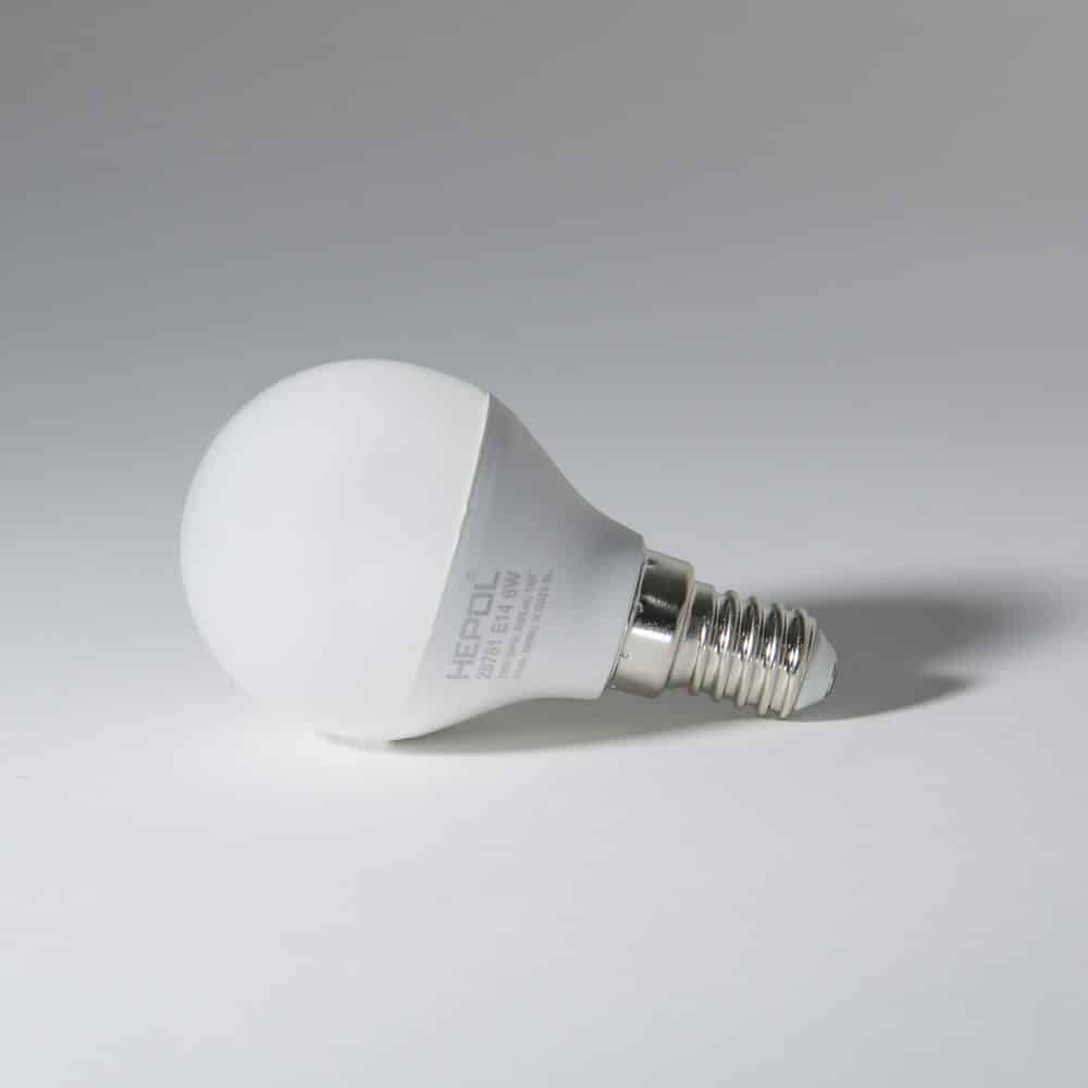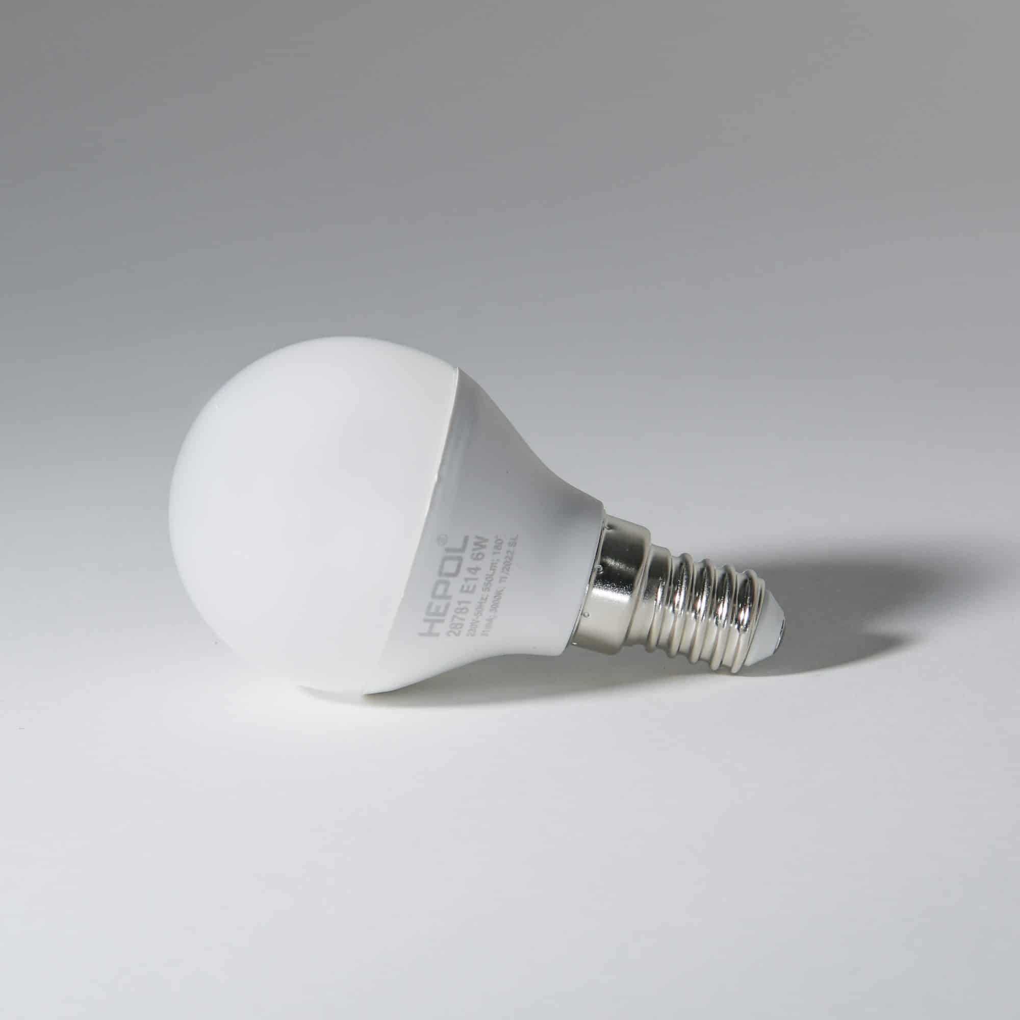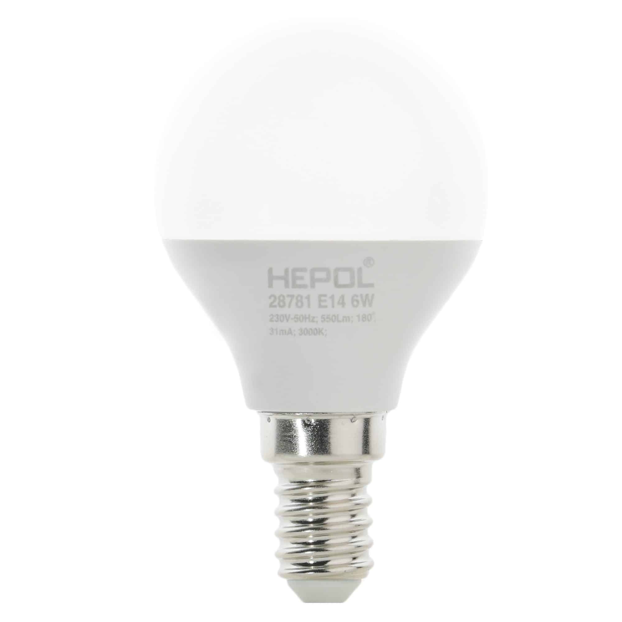 Bec LED HEPOL DIMABIL, formă sferic, E14, 6W, 25000 ore, lumină caldă