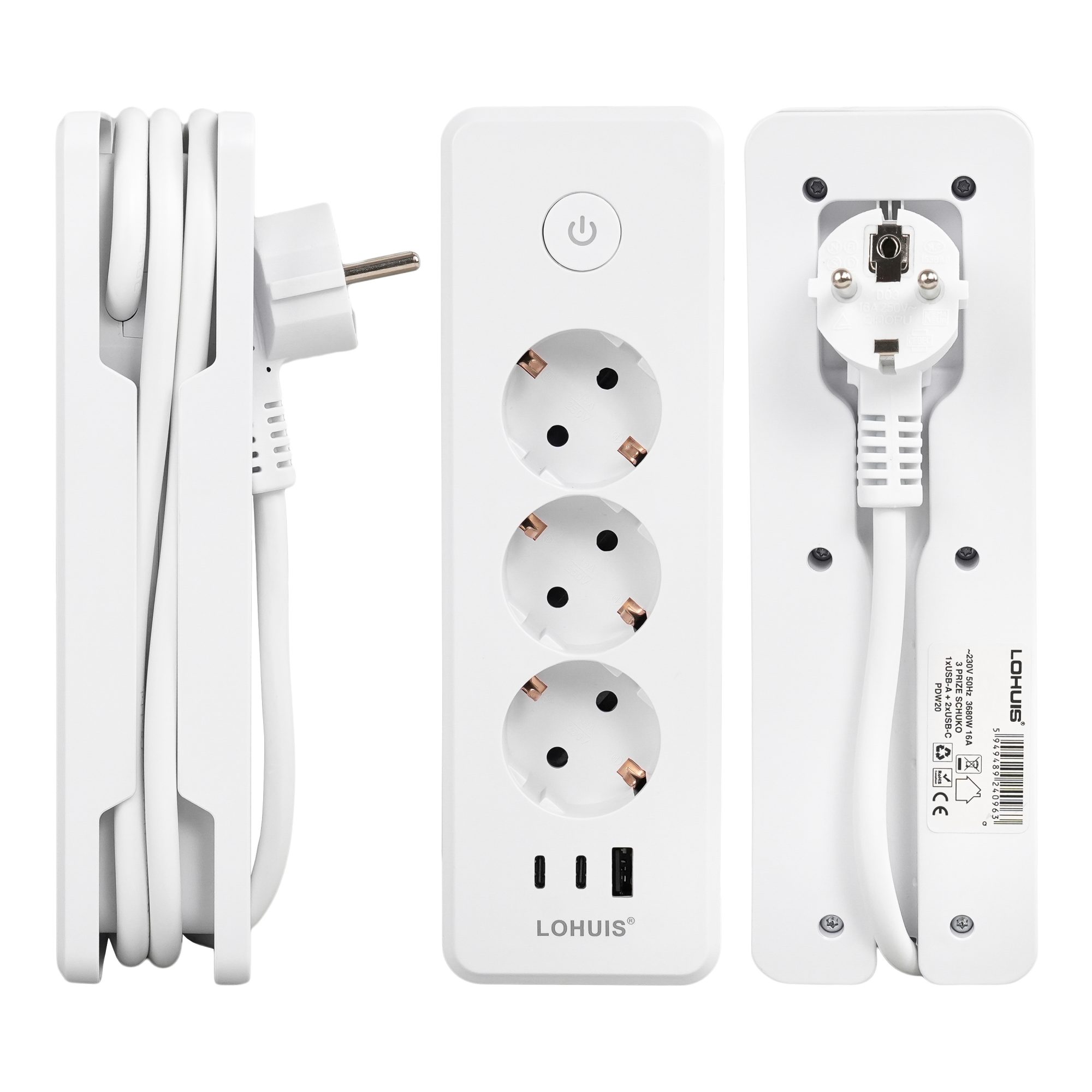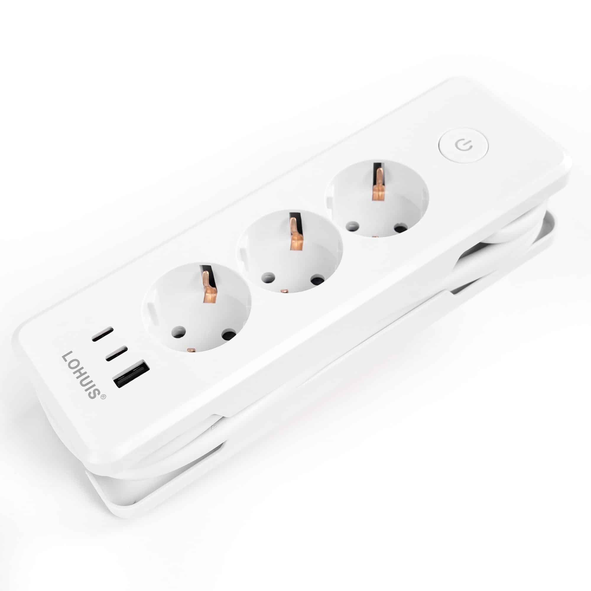 Prelungitor călătorie E30 cu 3 prize, întrerupător luminos, cu încărcare USB PD20W, 1xUSB-A și 2xUSB-C