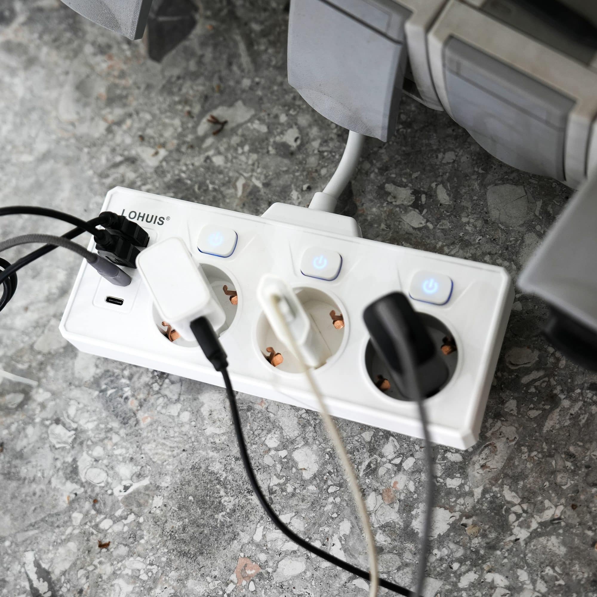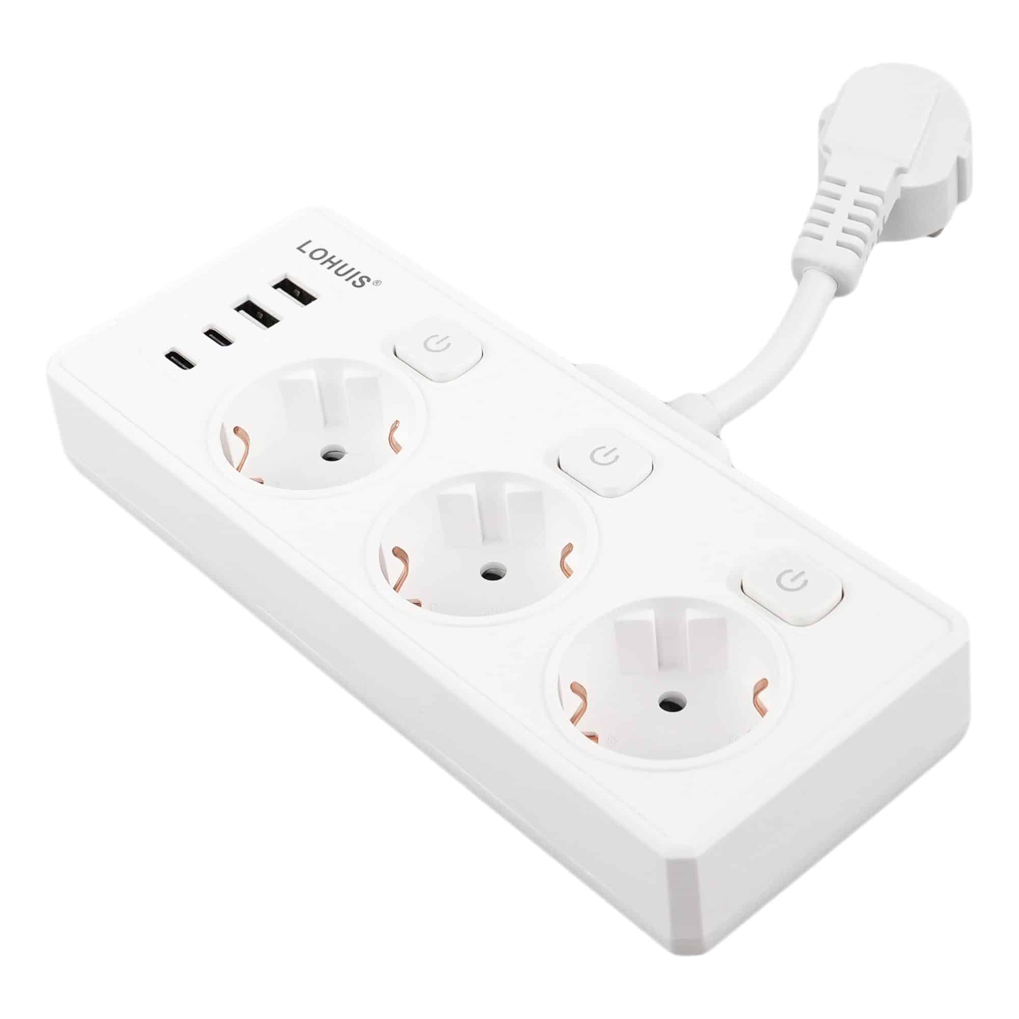 Prelungitor electric (5 cm) cu 3 prize, 3 întrerupătoare și 4 USB (2 USB-A+2 TIP-C), 230Vca, 3680W, 16A, LOHUIS